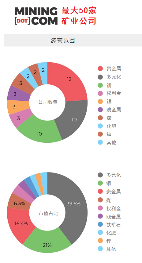 五大多元化巨头合计市值占前50家矿企总市值的比例从2022年底的38%回落至29%。