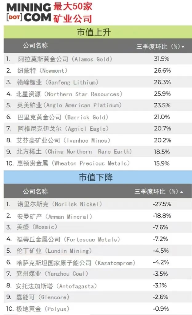 2024年三季度末,Mining.com网站列出的最有价值50家矿企总市值为1.51万亿,较6月底增长近760亿美元,很大程度上源于黄金和权利金公司。