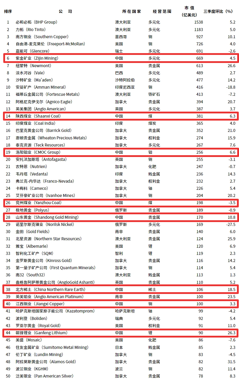据Mining.com网站报道,世界最大50家矿企目前市值为1.5万亿美元,三季度上升了760亿美元,因为金矿商排名上升,以及近期中国矿企市值增长。